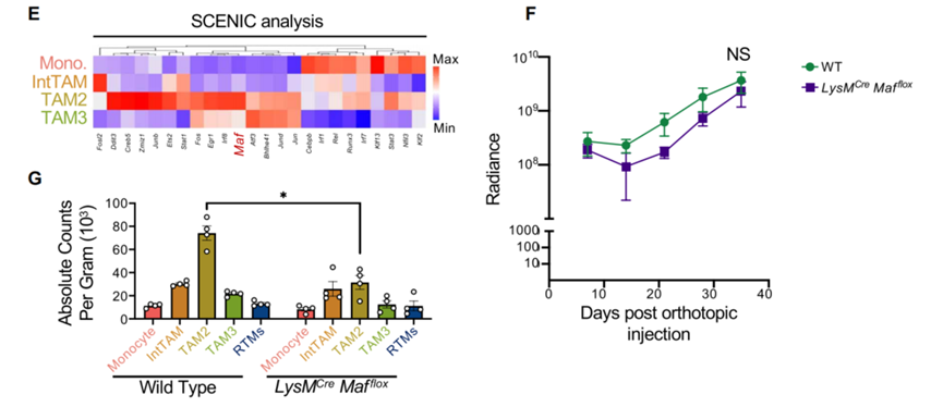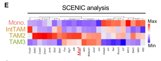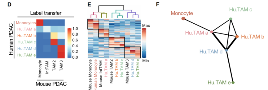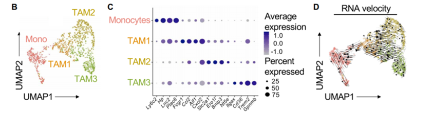 随着人们对肿瘤微环境(TME)中免疫细胞作用的深入理解,目前已有针对特定肿瘤类型的有效免疫治疗方法。虽然一些免疫疗法,如大名鼎鼎的PD-1抗体在黑色素瘤中显示出较好的疗效,但却对胰腺导管腺癌患者(PDAC)的益处非常小。为了探究不同免疫疗法之间的差异,需要更深入地探索TME中免疫系统相关部分的生物学特性。 肿瘤相关巨噬细胞(TAMs)是TME中最丰富的免疫细胞,与肿瘤生长、血管生成、细胞外基质重塑、免疫调节/抑制和转移扩散密切相关。此外,单细胞RNA测序(scRNA-seq)已经确定存在不同位置、具有不同功能的TAMs亚群。尽管TAM是未来免疫治疗的潜在靶点,但尚未完全了解它们的发展轨迹或不同TAM亚群之间的空间关系。 为此,上海交通大学黄来源等团队希望进一步了解单核细胞在PDAC中转变为肿瘤相关巨噬细胞的过程,并探讨不同肿瘤相关巨噬细胞亚群之间的发展关系。为了实现这一目标,研究者使用胰腺导管腺癌小鼠模型,并采用了单核细胞命运映射技术,以及一种可诱导的Cre重组酶与突变雌激素受体-配体结合结构域(CreERT2)相结合的方法,能够在肿瘤微环境中追踪单核细胞的行径。研究人员阐明单核细胞是如何变成具有特定位置和功能的TAM亚群,并发现转录因子Maf是癌症免疫治疗的潜在靶点。本文章近期发表在science immunology 上。 01 单核细胞分化:研究揭示了单核细胞首先分化为一个短暂的中间TAMs群体,这个群体被称为中间TAMs(IntTAMs)。这些细胞具有独特的转录状态,构成了单核细胞和TAM2/TAM3分化之间的中间态(图1)。 图1 单核细胞分化存在中间态 分化路径:IntTAMs进一步分化为两种更成熟的TAMs群体,即TAM2和TAM3(图2)。这一分化过程受到肿瘤微环境影响,意味着TAMs的表型主要由它们所处的局部微环境决定。 02 03 04 结语 巨噬细胞的特征和功能主要由三个因素决定:一是它们是如何发育形成的,即它们的“出身”;二是它们所处的生理环境,即它们的“居住地”;三是它们所接触到的维持体内平衡或者促炎信号。这些因素共同影响巨噬细胞的行为和功能。巨噬细胞的来源可以是胚胎时期的前体细胞,也可以是成年后血液循环中的单核细胞。不同的组织中,这两种来源的巨噬细胞各自占有特定的比例,这些比例是该组织的一个特征,并且这两种巨噬细胞在发育过程中有着明显的差异。在肿瘤微环境中,巨噬细胞的来源和功能特点可能会发生改变。特别是在胰腺导管腺癌的小鼠模型中,研究发现大约70%的肿瘤相关巨噬细胞是来源于单核细胞,这些细胞与从胚胎发育来的巨噬细胞在功能上有所不同。这揭示了肿瘤微环境可能对巨噬细胞的来源和功能有显著影响。 我们现在更清楚地了解到肿瘤的动态环境是双向互动的:肿瘤环境不仅影响肿瘤相关巨噬细胞的种类和功能,同时肿瘤相关巨噬细胞也影响着肿瘤环境的形成。这种相互作用逐渐变得明显,为我们理解肿瘤生物学提供了新的视角。