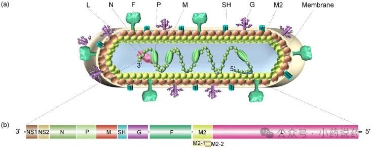 RSV是一种包膜球形RNA病毒,属于肺炎科正肺病毒属;当感染发展时,RSV会使细胞融合形成大细胞,称为合胞体。病毒的结构主要由三种膜蛋白组成:一种小疏水蛋白(SH)、一种附着糖蛋白(G)和一种融合蛋白(F),其中G蛋白与F蛋白在细胞融合中起着重要作用,同时也是刺激机体产生保护性抗体的蛋白。根据G蛋白序列,可以分为亚型A和B。这两种亚型在流行季节同时传播,但通常每年都有其中一种占主导地位。这种病毒的复制周期容易出错,允许快速产生突变,从而导致RSV毒力的变化以及制备抗病毒药物或疫苗的困难。