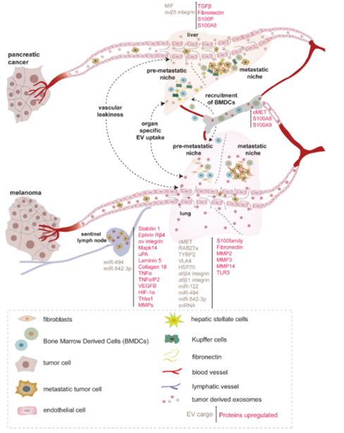 细胞外囊泡在特定器官内转移前壁龛的形成中起着关键作用。外泌体是一种小的膜结合囊泡,是细胞外囊泡群的一部分,在转移前生态位形成中起着至关重要的作用(图1)。这些细胞外囊泡能够将各种生物分子(包括蛋白质、mRNAs、microRNAs、小RNAs和DNA片段)转移到受体细胞。这种现象使得肿瘤细胞与其周围环境之间的分子信息交换成为可能,从而促进了转移前生态位的建立。microRNAs (miRNAs)在肿瘤生长和转移的多方面过程中起着关键作用,涵盖了癌变的所有阶段。异常的miRNA表达模式是癌细胞的标志,许多癌症类型表现出miRNA水平升高或降低,癌症分泌的外泌体也显示出异常的miRNA谱。通过调节受体细胞中癌基因和/或肿瘤抑制基因的表达,这些miRNAs可以影响细胞过程并促进肿瘤发生。