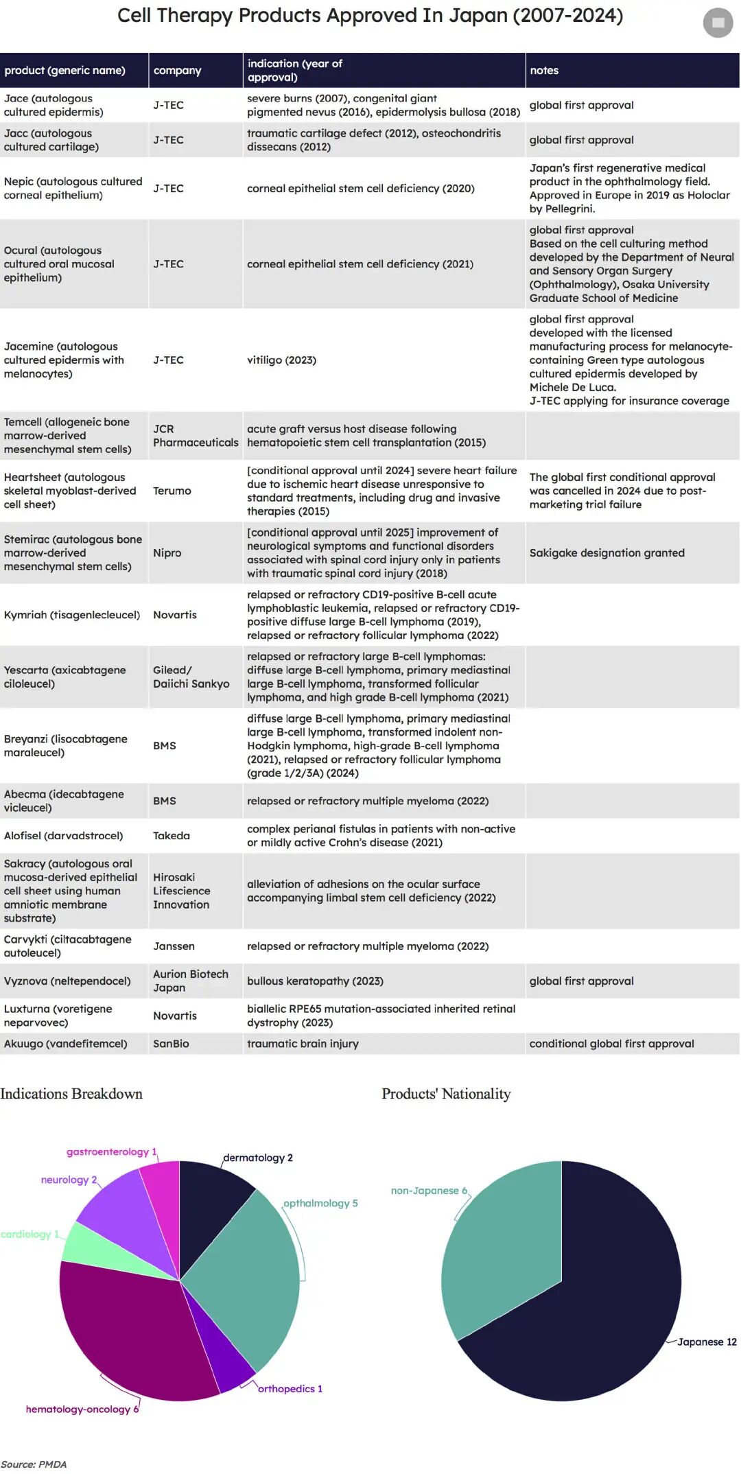 2012年,因发现诱导多能干细胞(iPSC)技术,日本京都大学教授山中伸弥获得诺贝尔奖。此后,日本政府开始积极在细胞治疗领域布局。通过建立《再生医学促进法》《再生医学安全法》等特殊法规监管途径,十多年来,日本不遗余力地鼓励细胞疗法的开发和商业化,批准了许多产品。它们大部分是由日本公司推出的,但也包括来自欧美MNC的CAR-T疗法。然而,由于某些产品的疗效缺乏可预测性,日本近期修改了该领域的法规,谨慎地缩小附条件批准范围,降低价格补贴。商业探索喜忧参半,一些细胞产品已退出日本市场。对于其他国家,能从日本的处境看到多少自己的影子?到目前为止,日本已经批准了18种细胞疗法,包括两款基于附条件批准框架的产品。适应症分布上,用于治疗血液瘤的产品最多,共计6种。在神经、眼科、骨科等其他疾病领域,也都有疗法覆盖。从地域看,12种疗法来自日本,占比近七成。其中,光是J-TEC就推出5种。2015年之前,J-TEC的Jace(自体培养表皮)和Jacc(自体培养软骨)是日本仅有的两款获批细胞产品。很多适应症都是在那之后获得批准的。最近一款上市产品,是由日本公司SanBio开发的同种异体间充质干细胞疗法Akuugo,用于改善与创伤性脑损伤相关的慢性运动性麻痹。7月底,Akuugo首次获得附条件批准。2013年,时任日本首相安倍晋三在其经济政策中指出,政府应牵头推动创新医疗研发的全国性举措,并承诺到2022年这10年间,投资1100亿日元(约合7.53亿美元)支持再生医学发展。到2014年,安倍政府通过内阁府推动《健康医疗战略推进法》出台,并于2015年成立了专门负责协调和支持国内药物研发项目(不仅仅是细胞疗法)的日本医学研究开发机构(AMED)。AMED旨在通过横跨厚生劳动省(MHLW)、经济产业省(METI)以及文部科学省(MEXT)三个部门,架起政府、公司和学术机构的桥梁。从2015年到2020年,AMED每年提供约140亿到160亿日元(约合0.97亿到1.11亿美元)用于支持国内药物研发,其中近一半(65亿日元)用于iPSC领域。大约在安倍政府提供资金支持的同一时间,日本颁布了《再生医学促进法》,对《药品和医疗器械法案》进行修订,引入细胞和基因疗法等再生医学产品的附条件批准框架。改革前,小分子药物等疗法必须经过昂贵且繁琐的三个阶段临床试验,才能获得日本药品和医疗器械管理局(PMDA)的批准。为了缩短上市时间,该方案允许在若干条件下,提前批准已证实安全性和具备“潜在”疗效的疗法。之后,这些产品需要开展上市后的试验以确认疗效,并在附条件批准期内提交申请以获得全面批准。Nature刊登的一篇文章介绍,基于这个框架,再生医学疗法开发商将不必按照阶段推进临床,而是在一项试验研究中证明疗效。如果变化足够显著,则一次试验中至少要有10名患者;如果改善幅度较小,则要有几百名患者。2014年11月,PMDA在一份解释性文件中表示,对iPSC相关产品的高期望和解决潜在安全风险的监管方法是该方案的关键。从2017年开始,附条件批准框架扩大到包括非再生创新药物。得益于这些转变,监管部门自2015年以来越来越频繁地对细胞和基因疗法产品点头。然而,日本也不得不的面临随之而来的问题,例如,产品附条件批准后的疗效不及预期,日本国民健康保险(NHI)计划中的成本与效益平衡压力。2015年,JCR Pharmaceuticals申报的同种异体骨髓源间充质干细胞(MSC)产品Temcell、Terumo申报的自体成骨肌源性细胞片产品HeartSheet,分别获得附条件批准。Temcell基于2003年由Osiris Therapeutics授权的MSC技术开发,被批准用于移植物抗宿主病,这是一种发生在同种异体骨髓移植患者中的严重并发症。Temcell每次治疗价格约为1400万日元,并成为日本最成功的细胞疗法之一,在2023年创造32亿日元(2210万美元)的收入。不过,HeartSheet就没那么幸运了。最初,HeartSheet获得治疗严重心力衰竭的5年有条件批准,但由于其适应症小等诸多限制,后来在上市后试验中招募患者时遇到困难。附条件批准期延长至8年后,Terumo在2023年申请全面批准,但未能证明其有效性。最终,Terumo决定在今年将HeartSheet撤出市场。另一个与之相似的案例,是日本公司Nipro开发的自体骨髓来源MSC产品Stemirac,附条件批准期间从2018年到2025年,用于改善与创伤性脊髓损伤相关的神经症状和功能障碍。自COVID-19以来,Nipro在Stemirac商业化方面受阻。最近该公司表示,它的目标是在2025年申请全面批准,并扩大与医疗机构的合作,以获得收入。5月,Nipro披露的最新财务报告说:“COVID-19的两年中,由于优先考虑重症患者,对Stemirac的管理一直很困难,其收入未能达到最初的预测。”附条件批准框架施行十年后,今年3月,MHLW发布一项新指南,以说明如何通过上市后的研究计划来认定细胞疗法的有效性。指南提到,药企和监管机构应事先明确附条件批准后所开展试验的适当性,应涉及病例数、开展试验的地点数、参数的客观性、病例的随机化、评价的盲法、对照组的建立等方面。为此,指南还提出了统计学上可推测有效性的参考基准。MHLW此举的背景是,2020年到2023年,日本政府根据此前“十年战略”的框架,对未来的创新药品政策进行一系列讨论。6月,因为附条件批准期限届满,AnGes撤回了日本首款基因疗法Collategene的制造和营销批准申请。随着Collategene、HeartSheet等几款产品证明其疗效的失败,MHLW认为,通过哪种类型的数据,并以怎样的准确性“推测”疗效,成为日本的关键挑战之一