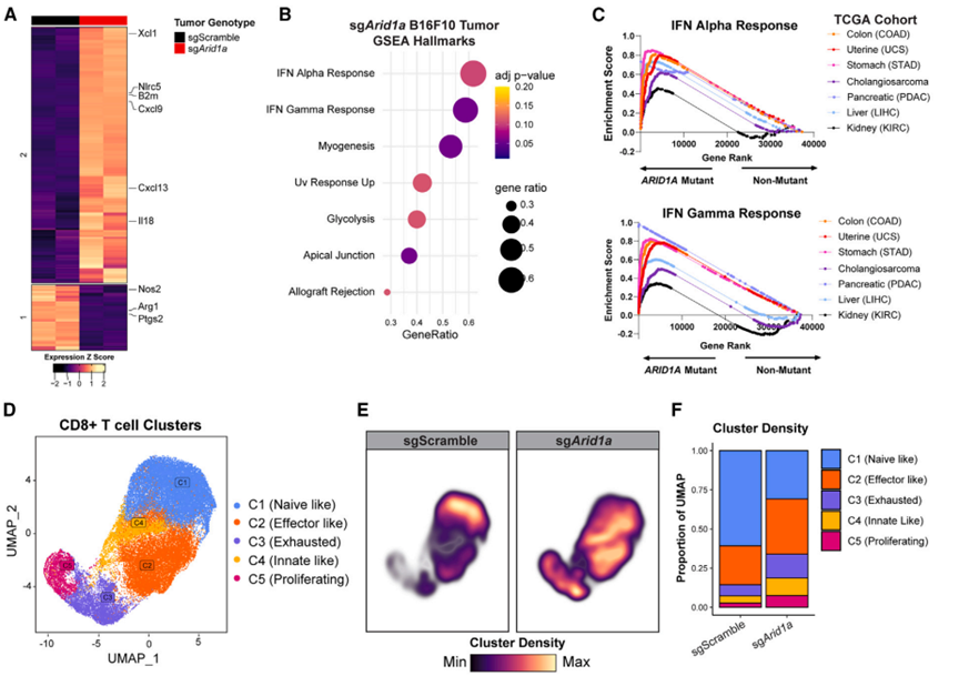 研究人员进一步发现,ARID1A缺失的肿瘤中,CD8+ T细胞的数量和活性都有所增加,这些细胞表现出更加成熟和有效的抗肿瘤特性(图3)。ARID1A缺失的肿瘤细胞会表现出一种特定的基因表达模式,他们称之为“ARID1A-IFN签名”。这种签名与肿瘤中的免疫反应强度和患者的预后密切相关。更重要的是,这种签名可以作为预测免疫检查点抑制剂疗效的潜在生物标志物。