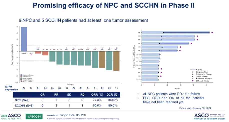 值得一提的是,除了单药治疗复发/转移性鼻咽癌外,乐普生物也在探索 MRG003 与 PD-1 抑制剂普特利单抗联合治疗鼻咽癌患者的效果。今年ASCO会议上,乐普生物公布了PD-1抗体普特利单抗+MRG003联合治疗的1/2期临床最新数据,其中二期临床部分,9例经PD-1+化疗一线治疗后进展的EGFR阳性鼻咽癌患者,ORR为77.8%(7/9),DCR为100%(9/9)。